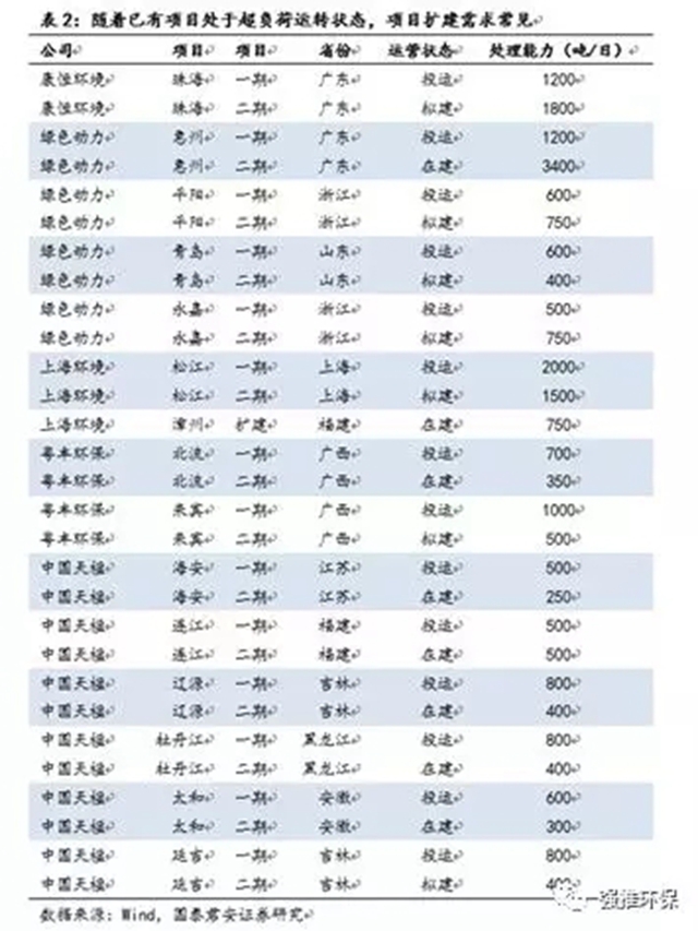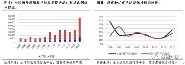 在已投運(yùn)的362個(gè)項(xiàng)目中,其中175個(gè)為單體項(xiàng)目,187個(gè)已經(jīng)或正在二期及三期擴(kuò)建。截止2018上半年,仍有10萬噸/日的擴(kuò)建項(xiàng)目正在建設(shè)中。這證明了我們的判斷,行業(yè)經(jīng)過多年的發(fā)展,隨著目前已建成的項(xiàng)目成熟運(yùn)行及項(xiàng)目周邊垃圾處理需求量的增加,已有項(xiàng)目處于超負(fù)荷運(yùn)轉(zhuǎn)狀態(tài),近幾年來進(jìn)入擴(kuò)建需求強(qiáng)烈的高峰期。