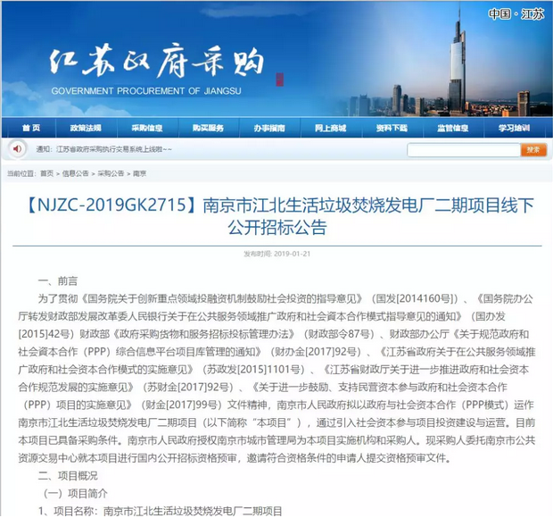 2019年1月21日,江蘇省政府采購(gòu)網(wǎng)發(fā)布南京市江北生活垃圾焚燒發(fā)電廠二期項(xiàng)目資格預(yù)審公告。公告顯示,項(xiàng)目選址位于南京市浦口區(qū)星甸街道,南京市浦口區(qū)星甸街道,絡(luò)洼隊(duì)以北,董莊隊(duì)以南,南京江北環(huán)保產(chǎn)業(yè)園內(nèi)。江北生活垃圾焚燒發(fā)電廠一、二期總規(guī)劃用地400畝,其中本期(二期)面積約196畝。項(xiàng)目估算總投資約為10.7億,項(xiàng)目特許期30年,其中建設(shè)期為2年。每噸垃圾處理費(fèi)為69元。