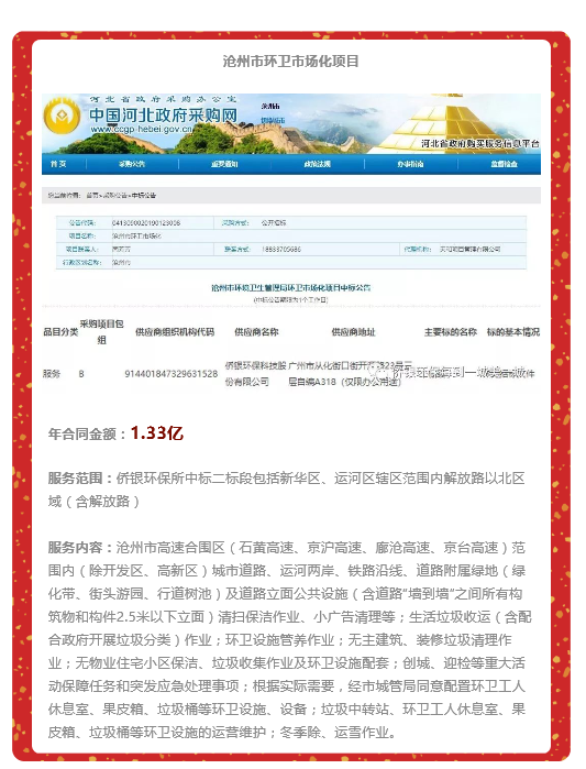 據(jù)悉,滄州市環(huán)衛(wèi)市場化項目此前受到業(yè)界廣泛關(guān)注,9家通過資格預(yù)審的入圍企業(yè)中8家為環(huán)衛(wèi)行業(yè)10強級別企業(yè)。經(jīng)過激烈角逐,僑銀環(huán)保中標(biāo)二標(biāo)段,年合同金額1.33億元。