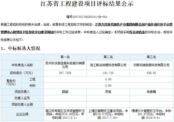 江蘇省徐圩新區(qū)環(huán)衛(wèi)運(yùn)營(yíng)管理中心智慧環(huán)衛(wèi)信息化平臺(tái)建設(shè)項(xiàng)木發(fā)布評(píng)標(biāo)結(jié)果公示,蘇州市伏泰信息科技股份有限公司被確定為擬確定中標(biāo)人,中標(biāo)金額為207.73萬(wàn)。