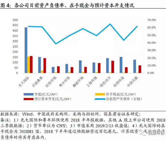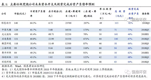 我們測算,存量項(xiàng)目達(dá)產(chǎn)后,9家垃圾焚燒重點(diǎn)上市公司平均資產(chǎn)負(fù)債率提升至66%。1)目前主要垃圾焚燒上市公司資產(chǎn)負(fù)債率平均為54%,在手現(xiàn)金與市值之比平均為12%。2)預(yù)計(jì)的資本開支完成之后,各公司的平均資產(chǎn)負(fù)債率將提升為66%。3)光大國際:考慮到供股募資,在預(yù)計(jì)資本開支都完成后,資產(chǎn)負(fù)債率將由2018H1的61%降低到46%,這主要是由于2018下半年公司進(jìn)行了大規(guī)模的供股募資百億港元,在手現(xiàn)金充沛。強(qiáng)大的融資能力也是公司的核心競爭力之一,為項(xiàng)目落地提供充分支持。4)綠色動力、中國天楹:在預(yù)計(jì)資本開支都完成后,資產(chǎn)負(fù)債率將達(dá)到較高水平,這意味著公司或?qū)⒉捎闷渌谫Y方式或放緩某些新項(xiàng)目資金投入的節(jié)奏。5)旺能環(huán)境、偉明環(huán)保等其他6家公司:在預(yù)計(jì)資本開支都完成后,資產(chǎn)負(fù)債率將在65%左右水平,后續(xù)隨著項(xiàng)目進(jìn)入運(yùn)營期現(xiàn)金回流貸款償還,資產(chǎn)負(fù)債率水平將逐步下降。