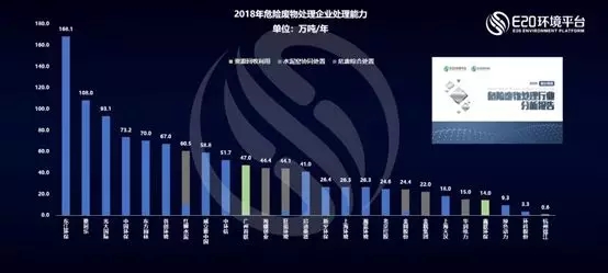 我國危廢行業(yè)仍處于發(fā)展期,類似于美國危廢行業(yè)的二十世紀(jì)90 年代初期,行業(yè)仍呈現(xiàn)“小、散、亂”的局面。目前我國前十家企業(yè)集中度(CR10)參數(shù)值較低,在7%左右。下圖為2018年我國危廢行業(yè)主要企業(yè)處理能力的排名。