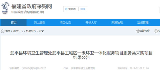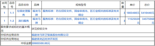 福建省武平縣主城區(qū)一級(jí)環(huán)衛(wèi)一體化服務(wù)項(xiàng)目服務(wù)類采購項(xiàng)目發(fā)布結(jié)果公告,福建龍馬環(huán)衛(wèi)裝備股份有限公司成為中標(biāo)的社會(huì)資本方,中標(biāo)金額為3998.55萬。