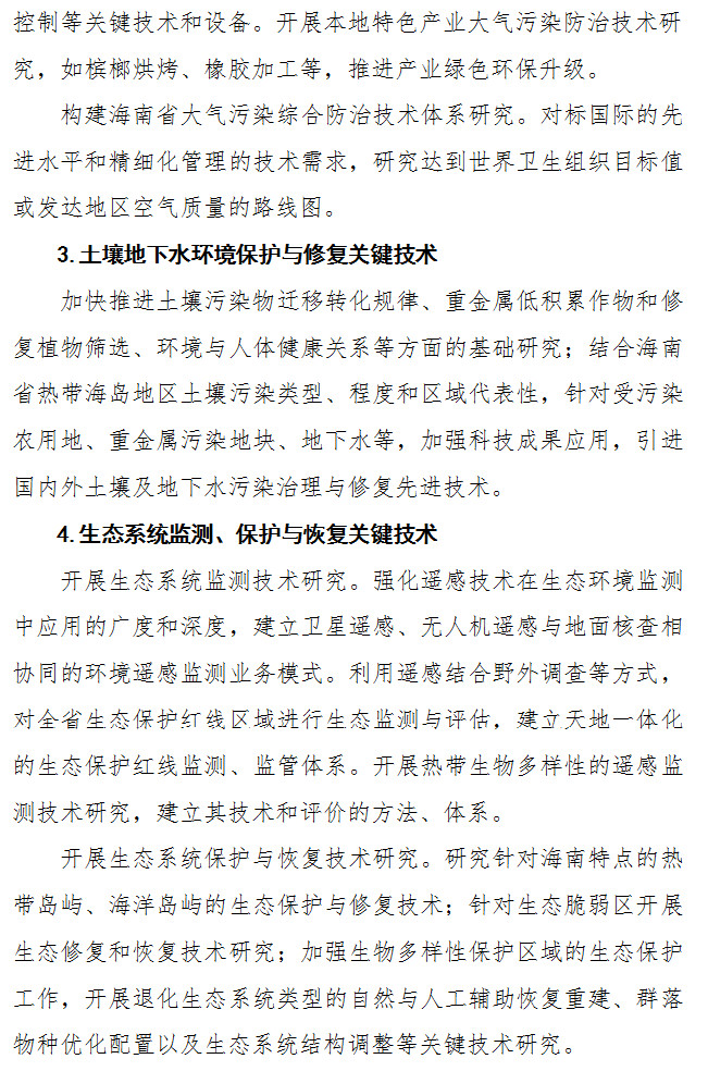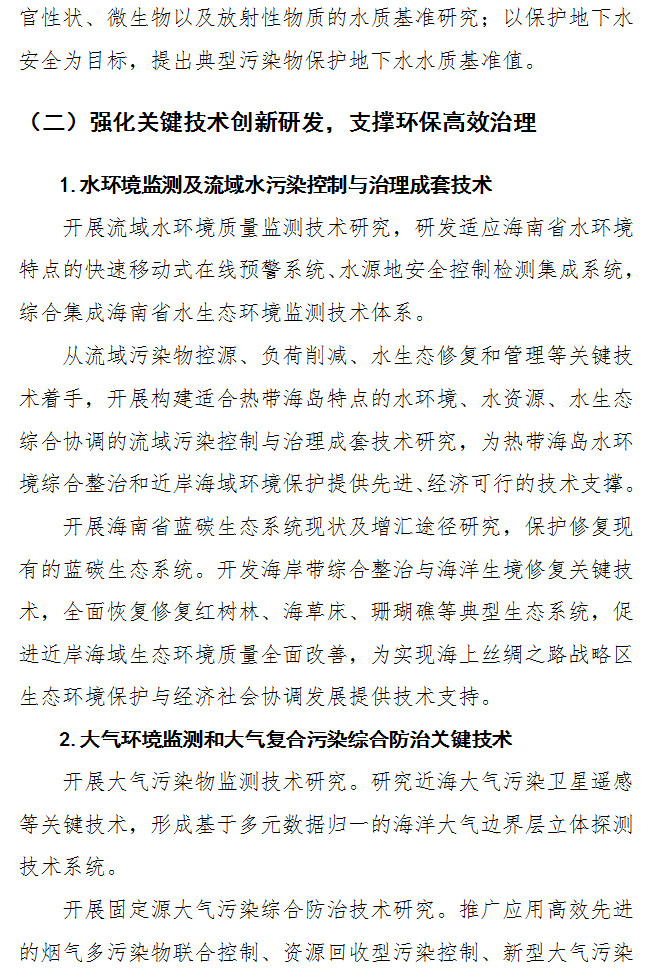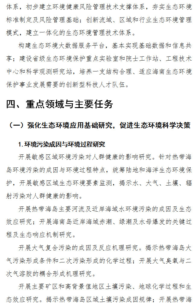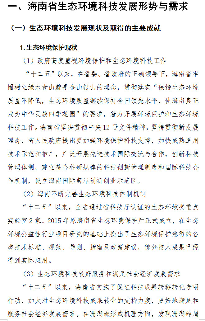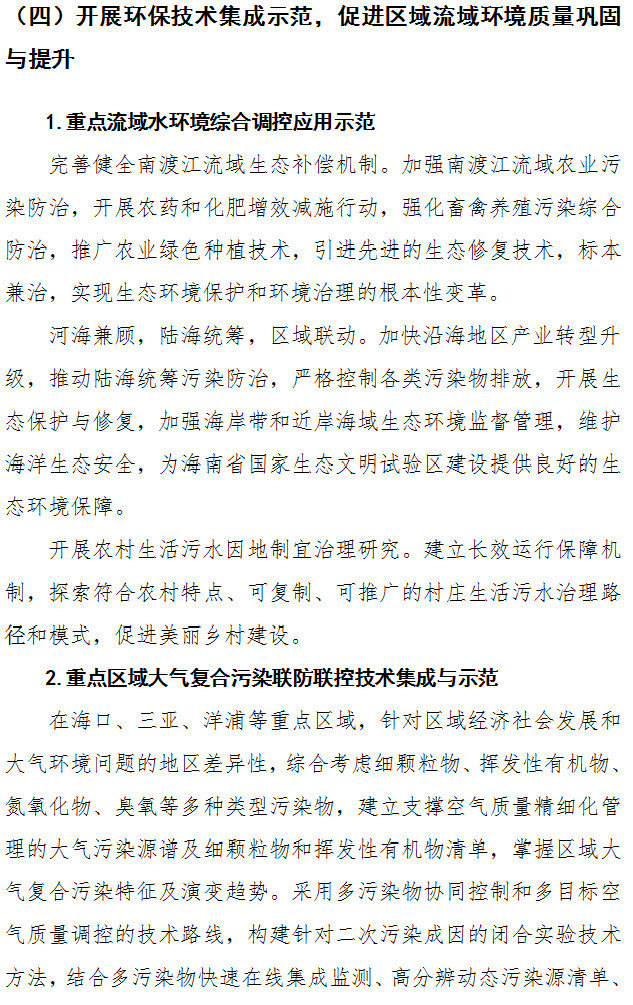 近日,海南省印發(fā)了《海南省生態(tài)環(huán)境科技發(fā)展規(guī)劃(2019-2025)》的通知,通知規(guī)定要強(qiáng)化大氣環(huán)境監(jiān)測(cè)和大氣污染綜合防治關(guān)鍵技術(shù)、水環(huán)境監(jiān)測(cè)及流域水污染控制與治理成套技、土壤地下水環(huán)境保護(hù)與修復(fù)關(guān)鍵技術(shù)、固體廢物處理處置及有毒有害污染物控制技術(shù)等,全文如下: