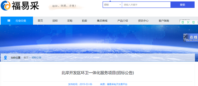 福建省北岸開發(fā)區(qū)環(huán)衛(wèi)一體化服務(wù)項目發(fā)布招標(biāo)公告。