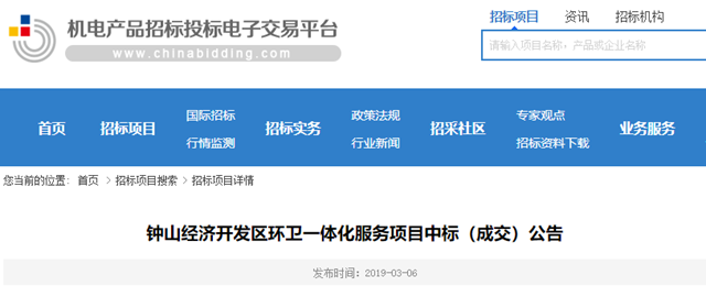 貴州省鐘山經(jīng)濟開發(fā)區(qū)環(huán)衛(wèi)一體化服務項目發(fā)布中標(成交)公告,福建龍馬環(huán)衛(wèi)裝備股份有限公司成為中標的社會資本方。