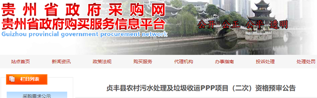 貴州省貞豐縣農(nóng)村污水處理及垃圾收運PPP項目發(fā)布第二次資格預審公告。