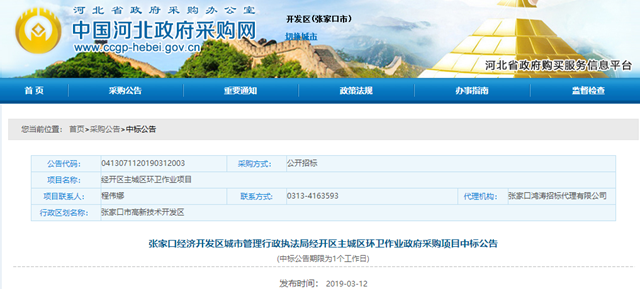 原標(biāo)題:北京環(huán)境中標(biāo)1.06億張家口經(jīng)開區(qū)主城區(qū)環(huán)衛(wèi)作業(yè)政府采購項目