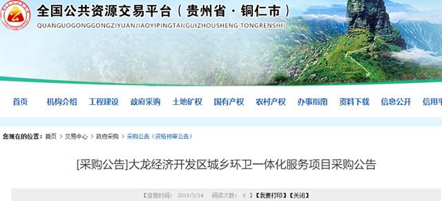 貴州省大龍經(jīng)濟開發(fā)區(qū)城鄉(xiāng)環(huán)衛(wèi)一體化服務項目發(fā)布采購公告。項目采購預算1855.59萬/年,服務期限20年,總金額約3.7億。