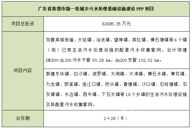 廣東省英德市新一輪城鄉(xiāng)污水處理基礎(chǔ)設(shè)施建設(shè)PPP項目