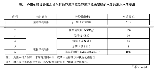 戶(hù)用處理設(shè)備出水排入其他環(huán)境功能及環(huán)境功能未明確的水體的,執(zhí)行下圖的出水水質(zhì)要求: