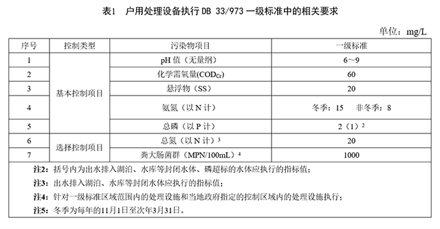 綜合考慮設(shè)施的處理規(guī)模、受納水體的環(huán)境容量、功能要求等多種因素,戶(hù)用處理設(shè)備出水直接排入GB 3838地表水Ⅱ、Ⅲ類(lèi)功能水域(劃定的飲用水水源保護(hù)區(qū)和游泳區(qū)除外)、GB 3097海水二類(lèi)功能水域、湖泊、水庫(kù)等封閉水域或半封閉水域時(shí),執(zhí)行DB 33/973中一級(jí)標(biāo)準(zhǔn)中的相關(guān)要求,詳見(jiàn)下圖: