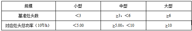 4.1.1餐飲服務單位規(guī)模按照基準灶頭數(shù)劃分為大型和中小型。基準灶頭數(shù)按灶的總發(fā)熱功率折算,每個基準灶頭對應的發(fā)熱功率為1.67×108J/h。餐飲服務單位的規(guī)模劃分參數(shù)見表1。