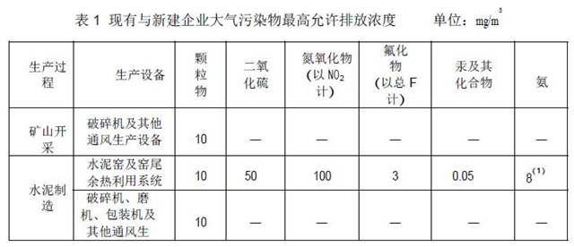 對于無組織排放的控制,《標準》要求在物料處理、輸送、裝卸等過程要實行封閉,尤其是在車船裝卸過程中還要采取有效的抑塵措施,生產(chǎn)車間內不得有可見的顆粒物排放存在。在《標準》實施之日起,水泥工業(yè)企業(yè)大氣污染物無組織排放濃度限制要按照下表執(zhí)行: