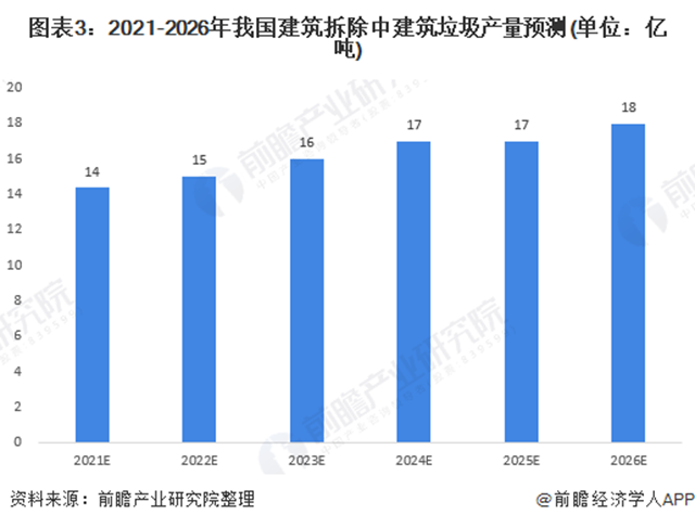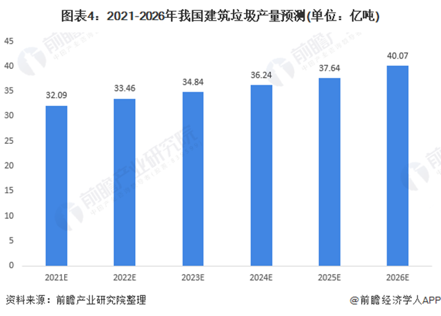 前瞻根據(jù)初步預(yù)測到2021年我國需要處理的建筑垃圾產(chǎn)量將達(dá)到32.09億噸,2026年,產(chǎn)量有望突破40億噸;若以35元/噸(運(yùn)輸費(fèi)與處置費(fèi))計(jì)算,預(yù)計(jì)2021年建筑垃圾處理市場規(guī)模將超過1400億元。