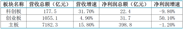 分板塊來看,科創(chuàng)板21家上市公司實(shí)現(xiàn)營(yíng)收總額177.5億元,同比增長(zhǎng)31.7%,實(shí)現(xiàn)凈利潤(rùn)總額22.4億元,同比下降9.8%;創(chuàng)業(yè)板63家上市公司實(shí)現(xiàn)營(yíng)收總額1055.1億元,同比增長(zhǎng)4.9%,實(shí)現(xiàn)凈利潤(rùn)總額31.7億元,同比增長(zhǎng)50.1%;主板93家上市公司實(shí)現(xiàn)營(yíng)收總額7182.3億元,同比增長(zhǎng)15.8%,實(shí)現(xiàn)凈利潤(rùn)總額398.8億元,同比下降1.2%。