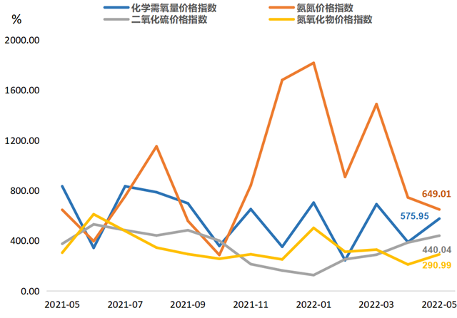 四項排污權(quán)指標:化學(xué)需氧量指數(shù)為575.95點(對應(yīng)價格23038.10元/噸·年)、氨氮指數(shù)為649.01點(對應(yīng)價格25960.20元/噸·年)、二氧化硫指數(shù)為440.04點(對應(yīng)價格4400.39元/噸·年)、氮氧化物指數(shù)為290.99點(對應(yīng)價格2909.90元/噸·年)。