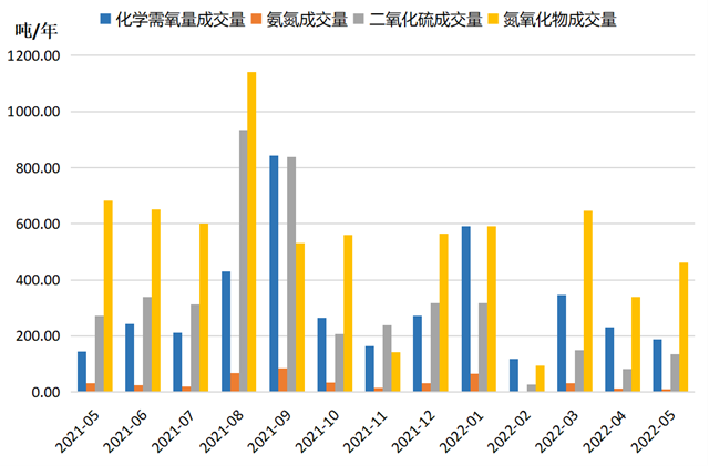 從環(huán)比情況看,化學(xué)需氧量、氨氮、二氧化硫、氮氧化物四項主要污染物交易量“兩升兩降”,其中,二氧化硫、氮氧化物成交量環(huán)比分別上升64.32%、36.56%,化學(xué)需氧量、氨氮成交量環(huán)比分別下降18.39%、19.64%。與上年同期相比看,僅有化學(xué)需氧量同比增長30.81%,氨氮、二氧化硫、氮氧化物成交量同比降幅分別為65.64%、49.81%、32.18%。