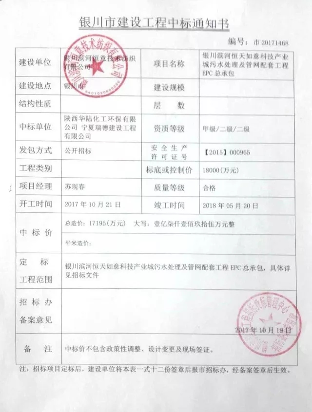 2017年10月19月,華陸環(huán)保憑借著豐富的行業(yè)經(jīng)驗(yàn)、良好的市場(chǎng)信譽(yù)、優(yōu)秀的設(shè)計(jì)團(tuán)隊(duì)、完善的服務(wù)體系以及專業(yè)的投標(biāo)方案,成功中標(biāo)銀川濱河恒天如意科技產(chǎn)業(yè)城污水處理及管網(wǎng)配套工程EPC總承包項(xiàng)目(以下簡(jiǎn)稱:中標(biāo)項(xiàng)目),中標(biāo)金額為1.7195億元。
