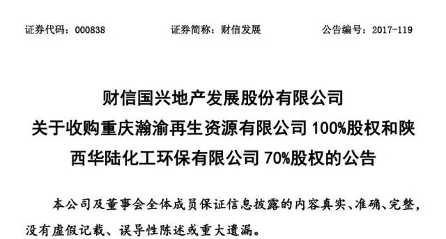 2017年9月29日,財(cái)信國(guó)興地產(chǎn)發(fā)展股份有限公司(以下簡(jiǎn)稱“財(cái)信發(fā)展”,股票代碼:000838)收購(gòu)陜西華陸化工環(huán)保有限公司70%股權(quán)(詳見《財(cái)信國(guó)興地產(chǎn)發(fā)展股份有限公司關(guān)于收購(gòu)重慶瀚渝再生資源有限公司100%股權(quán)和陜西華陸化工環(huán)保有限公司70%股權(quán)的公告》),華陸環(huán)保成為財(cái)信發(fā)展的控股子公司。