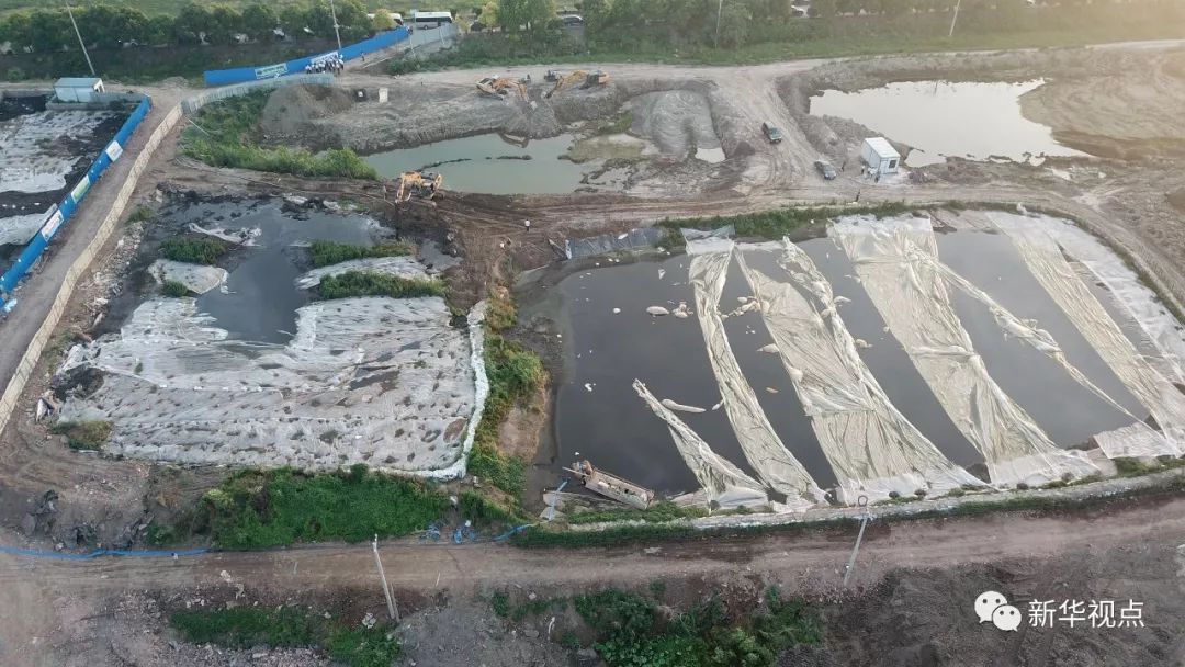 此外,泰興化工園區(qū)填埋化工廢料的地點(diǎn)距離污泥堆放點(diǎn)不到3公里。記者在現(xiàn)場(chǎng)看到,這一填埋點(diǎn)西臨長(zhǎng)江堤岸不到50米,污染地塊已加裝綠色保護(hù)網(wǎng)和防塵隔離欄,有兩臺(tái)挖掘機(jī)正在開挖排水明溝。