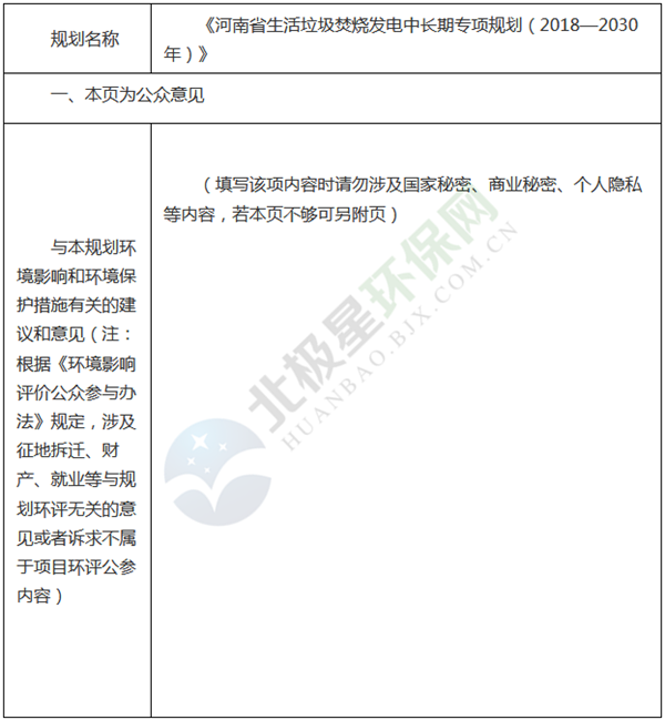 河南省生活垃圾焚燒發(fā)電中長期專項(xiàng)規(guī)劃(2018-2030年)環(huán)境影響評(píng)價(jià)公眾意見表